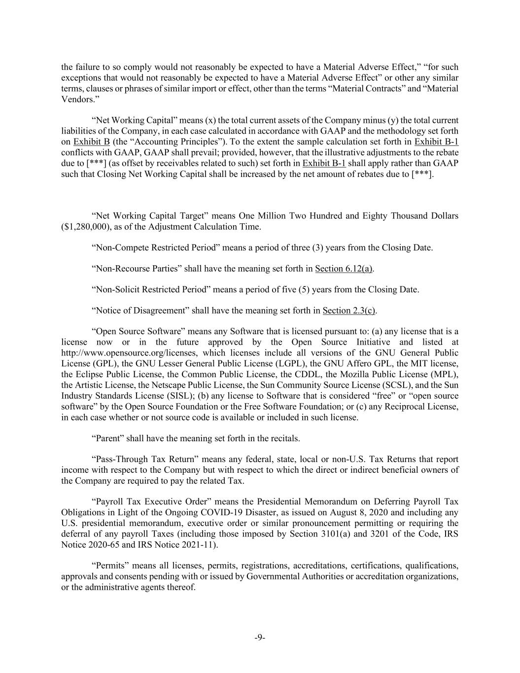 -9- the failure to so comply would not reasonably be expected to have a Material Adverse Effect,” “for such exceptions that would not reasonably be expected to have a Material Adverse Effect” or other any similar terms, clauses or phrases of similar import or effect, other than the terms “Material Contracts” and “Material Vendors.” “Net Working Capital” means (x) the total current assets of the Company minus (y) the total current liabilities of the Company, in each case calculated in accordance with GAAP and the methodology set forth on Exhibit B (the “Accounting Principles”). To the extent the sample calculation set forth in Exhibit B-1 conflicts with GAAP, GAAP shall prevail; provided, however, that the illustrative adjustments to the rebate due to [***] (as offset by receivables related to such) set forth in Exhibit B-1 shall apply rather than GAAP such that Closing Net Working Capital shall be increased by the net amount of rebates due to [***]. “Net Working Capital Target” means One Million Two Hundred and Eighty Thousand Dollars ($1,280,000), as of the Adjustment Calculation Time. “Non-Compete Restricted Period” means a period of three (3) years from the Closing Date. “Non-Recourse Parties” shall have the meaning set forth in Section 6.12(a). “Non-Solicit Restricted Period” means a period of five (5) years from the Closing Date. “Notice of Disagreement” shall have the meaning set forth in Section 2.3(c). “Open Source Software” means any Software that is licensed pursuant to: (a) any license that is a license now or in the future approved by the Open Source Initiative and listed at http://www.opensource.org/licenses, which licenses include all versions of the GNU General Public License (GPL), the GNU Lesser General Public License (LGPL), the GNU Affero GPL, the MIT license, the Eclipse Public License, the Common Public License, the CDDL, the Mozilla Public License (MPL), the Artistic License, the Netscape Public License, the Sun Community Source License (SCSL), and the Sun Industry Standards License (SISL); (b) any license to Software that is considered “free” or “open source software” by the Open Source Foundation or the Free Software Foundation; or (c) any Reciprocal License, in each case whether or not source code is available or included in such license. “Parent” shall have the meaning set forth in the recitals. “Pass-Through Tax Return” means any federal, state, local or non-U.S. Tax Returns that report income with respect to the Company but with respect to which the direct or indirect beneficial owners of the Company are required to pay the related Tax. “Payroll Tax Executive Order” means the Presidential Memorandum on Deferring Payroll Tax Obligations in Light of the Ongoing COVID-19 Disaster, as issued on August 8, 2020 and including any U.S. presidential memorandum, executive order or similar pronouncement permitting or requiring the deferral of any payroll Taxes (including those imposed by Section 3101(a) and 3201 of the Code, IRS Notice 2020-65 and IRS Notice 2021-11). “Permits” means all licenses, permits, registrations, accreditations, certifications, qualifications, approvals and consents pending with or issued by Governmental Authorities or accreditation organizations, or the administrative agents thereof.