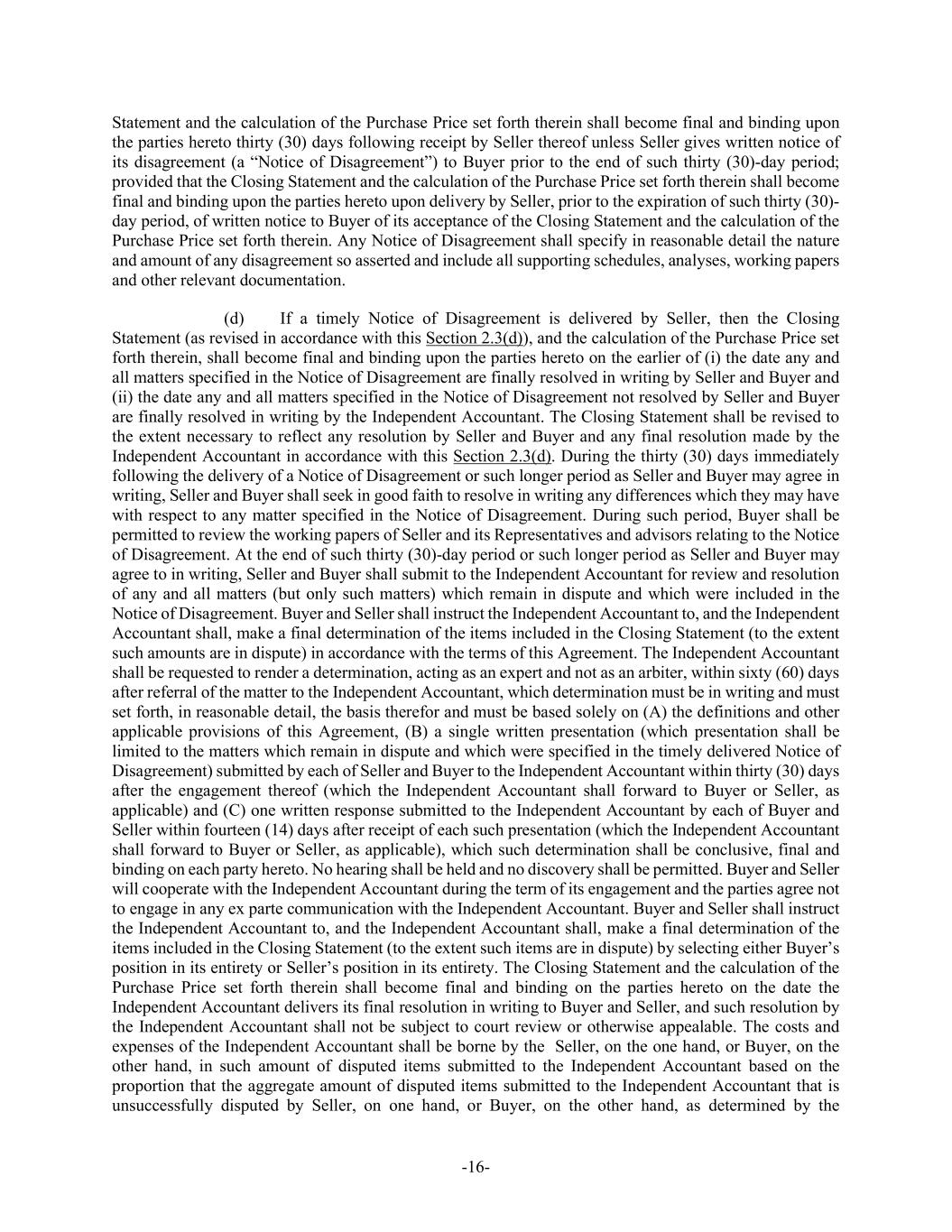 -16- Statement and the calculation of the Purchase Price set forth therein shall become final and binding upon the parties hereto thirty (30) days following receipt by Seller thereof unless Seller gives written notice of its disagreement (a “Notice of Disagreement”) to Buyer prior to the end of such thirty (30)-day period; provided that the Closing Statement and the calculation of the Purchase Price set forth therein shall become final and binding upon the parties hereto upon delivery by Seller, prior to the expiration of such thirty (30)- day period, of written notice to Buyer of its acceptance of the Closing Statement and the calculation of the Purchase Price set forth therein. Any Notice of Disagreement shall specify in reasonable detail the nature and amount of any disagreement so asserted and include all supporting schedules, analyses, working papers and other relevant documentation. (d) If a timely Notice of Disagreement is delivered by Seller, then the Closing Statement (as revised in accordance with this Section 2.3(d)), and the calculation of the Purchase Price set forth therein, shall become final and binding upon the parties hereto on the earlier of (i) the date any and all matters specified in the Notice of Disagreement are finally resolved in writing by Seller and Buyer and (ii) the date any and all matters specified in the Notice of Disagreement not resolved by Seller and Buyer are finally resolved in writing by the Independent Accountant. The Closing Statement shall be revised to the extent necessary to reflect any resolution by Seller and Buyer and any final resolution made by the Independent Accountant in accordance with this Section 2.3(d). During the thirty (30) days immediately following the delivery of a Notice of Disagreement or such longer period as Seller and Buyer may agree in writing, Seller and Buyer shall seek in good faith to resolve in writing any differences which they may have with respect to any matter specified in the Notice of Disagreement. During such period, Buyer shall be permitted to review the working papers of Seller and its Representatives and advisors relating to the Notice of Disagreement. At the end of such thirty (30)-day period or such longer period as Seller and Buyer may agree to in writing, Seller and Buyer shall submit to the Independent Accountant for review and resolution of any and all matters (but only such matters) which remain in dispute and which were included in the Notice of Disagreement. Buyer and Seller shall instruct the Independent Accountant to, and the Independent Accountant shall, make a final determination of the items included in the Closing Statement (to the extent such amounts are in dispute) in accordance with the terms of this Agreement. The Independent Accountant shall be requested to render a determination, acting as an expert and not as an arbiter, within sixty (60) days after referral of the matter to the Independent Accountant, which determination must be in writing and must set forth, in reasonable detail, the basis therefor and must be based solely on (A) the definitions and other applicable provisions of this Agreement, (B) a single written presentation (which presentation shall be limited to the matters which remain in dispute and which were specified in the timely delivered Notice of Disagreement) submitted by each of Seller and Buyer to the Independent Accountant within thirty (30) days after the engagement thereof (which the Independent Accountant shall forward to Buyer or Seller, as applicable) and (C) one written response submitted to the Independent Accountant by each of Buyer and Seller within fourteen (14) days after receipt of each such presentation (which the Independent Accountant shall forward to Buyer or Seller, as applicable), which such determination shall be conclusive, final and binding on each party hereto. No hearing shall be held and no discovery shall be permitted. Buyer and Seller will cooperate with the Independent Accountant during the term of its engagement and the parties agree not to engage in any ex parte communication with the Independent Accountant. Buyer and Seller shall instruct the Independent Accountant to, and the Independent Accountant shall, make a final determination of the items included in the Closing Statement (to the extent such items are in dispute) by selecting either Buyer’s position in its entirety or Seller’s position in its entirety. The Closing Statement and the calculation of the Purchase Price set forth therein shall become final and binding on the parties hereto on the date the Independent Accountant delivers its final resolution in writing to Buyer and Seller, and such resolution by the Independent Accountant shall not be subject to court review or otherwise appealable. The costs and expenses of the Independent Accountant shall be borne by the Seller, on the one hand, or Buyer, on the other hand, in such amount of disputed items submitted to the Independent Accountant based on the proportion that the aggregate amount of disputed items submitted to the Independent Accountant that is unsuccessfully disputed by Seller, on one hand, or Buyer, on the other hand, as determined by the