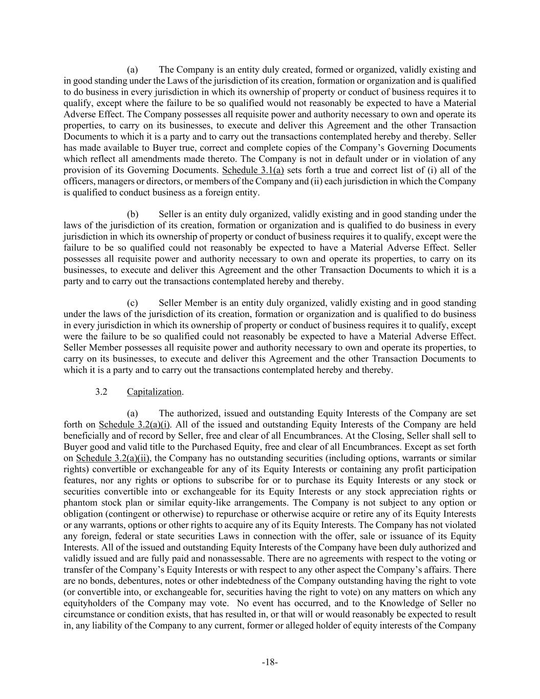 -18- (a) The Company is an entity duly created, formed or organized, validly existing and in good standing under the Laws of the jurisdiction of its creation, formation or organization and is qualified to do business in every jurisdiction in which its ownership of property or conduct of business requires it to qualify, except where the failure to be so qualified would not reasonably be expected to have a Material Adverse Effect. The Company possesses all requisite power and authority necessary to own and operate its properties, to carry on its businesses, to execute and deliver this Agreement and the other Transaction Documents to which it is a party and to carry out the transactions contemplated hereby and thereby. Seller has made available to Buyer true, correct and complete copies of the Company’s Governing Documents which reflect all amendments made thereto. The Company is not in default under or in violation of any provision of its Governing Documents. Schedule 3.1(a) sets forth a true and correct list of (i) all of the officers, managers or directors, or members of the Company and (ii) each jurisdiction in which the Company is qualified to conduct business as a foreign entity. (b) Seller is an entity duly organized, validly existing and in good standing under the laws of the jurisdiction of its creation, formation or organization and is qualified to do business in every jurisdiction in which its ownership of property or conduct of business requires it to qualify, except were the failure to be so qualified could not reasonably be expected to have a Material Adverse Effect. Seller possesses all requisite power and authority necessary to own and operate its properties, to carry on its businesses, to execute and deliver this Agreement and the other Transaction Documents to which it is a party and to carry out the transactions contemplated hereby and thereby. (c) Seller Member is an entity duly organized, validly existing and in good standing under the laws of the jurisdiction of its creation, formation or organization and is qualified to do business in every jurisdiction in which its ownership of property or conduct of business requires it to qualify, except were the failure to be so qualified could not reasonably be expected to have a Material Adverse Effect. Seller Member possesses all requisite power and authority necessary to own and operate its properties, to carry on its businesses, to execute and deliver this Agreement and the other Transaction Documents to which it is a party and to carry out the transactions contemplated hereby and thereby. 3.2 Capitalization. (a) The authorized, issued and outstanding Equity Interests of the Company are set forth on Schedule 3.2(a)(i). All of the issued and outstanding Equity Interests of the Company are held beneficially and of record by Seller, free and clear of all Encumbrances. At the Closing, Seller shall sell to Buyer good and valid title to the Purchased Equity, free and clear of all Encumbrances. Except as set forth on Schedule 3.2(a)(ii), the Company has no outstanding securities (including options, warrants or similar rights) convertible or exchangeable for any of its Equity Interests or containing any profit participation features, nor any rights or options to subscribe for or to purchase its Equity Interests or any stock or securities convertible into or exchangeable for its Equity Interests or any stock appreciation rights or phantom stock plan or similar equity-like arrangements. The Company is not subject to any option or obligation (contingent or otherwise) to repurchase or otherwise acquire or retire any of its Equity Interests or any warrants, options or other rights to acquire any of its Equity Interests. The Company has not violated any foreign, federal or state securities Laws in connection with the offer, sale or issuance of its Equity Interests. All of the issued and outstanding Equity Interests of the Company have been duly authorized and validly issued and are fully paid and nonassessable. There are no agreements with respect to the voting or transfer of the Company’s Equity Interests or with respect to any other aspect the Company’s affairs. There are no bonds, debentures, notes or other indebtedness of the Company outstanding having the right to vote (or convertible into, or exchangeable for, securities having the right to vote) on any matters on which any equityholders of the Company may vote. No event has occurred, and to the Knowledge of Seller no circumstance or condition exists, that has resulted in, or that will or would reasonably be expected to result in, any liability of the Company to any current, former or alleged holder of equity interests of the Company