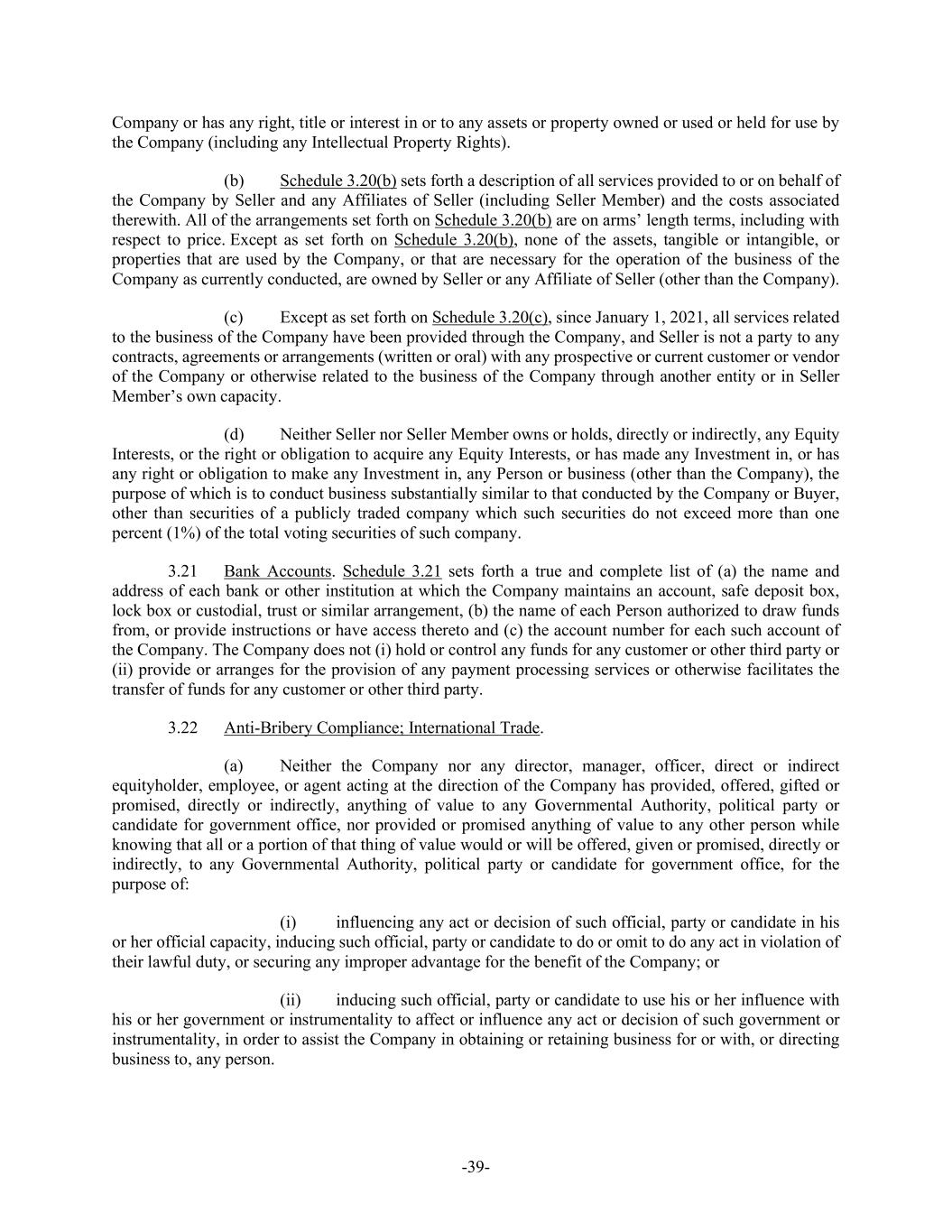 -39- Company or has any right, title or interest in or to any assets or property owned or used or held for use by the Company (including any Intellectual Property Rights). (b) Schedule 3.20(b) sets forth a description of all services provided to or on behalf of the Company by Seller and any Affiliates of Seller (including Seller Member) and the costs associated therewith. All of the arrangements set forth on Schedule 3.20(b) are on arms’ length terms, including with respect to price. Except as set forth on Schedule 3.20(b), none of the assets, tangible or intangible, or properties that are used by the Company, or that are necessary for the operation of the business of the Company as currently conducted, are owned by Seller or any Affiliate of Seller (other than the Company). (c) Except as set forth on Schedule 3.20(c), since January 1, 2021, all services related to the business of the Company have been provided through the Company, and Seller is not a party to any contracts, agreements or arrangements (written or oral) with any prospective or current customer or vendor of the Company or otherwise related to the business of the Company through another entity or in Seller Member’s own capacity. (d) Neither Seller nor Seller Member owns or holds, directly or indirectly, any Equity Interests, or the right or obligation to acquire any Equity Interests, or has made any Investment in, or has any right or obligation to make any Investment in, any Person or business (other than the Company), the purpose of which is to conduct business substantially similar to that conducted by the Company or Buyer, other than securities of a publicly traded company which such securities do not exceed more than one percent (1%) of the total voting securities of such company. 3.21 Bank Accounts. Schedule 3.21 sets forth a true and complete list of (a) the name and address of each bank or other institution at which the Company maintains an account, safe deposit box, lock box or custodial, trust or similar arrangement, (b) the name of each Person authorized to draw funds from, or provide instructions or have access thereto and (c) the account number for each such account of the Company. The Company does not (i) hold or control any funds for any customer or other third party or (ii) provide or arranges for the provision of any payment processing services or otherwise facilitates the transfer of funds for any customer or other third party. 3.22 Anti-Bribery Compliance; International Trade. (a) Neither the Company nor any director, manager, officer, direct or indirect equityholder, employee, or agent acting at the direction of the Company has provided, offered, gifted or promised, directly or indirectly, anything of value to any Governmental Authority, political party or candidate for government office, nor provided or promised anything of value to any other person while knowing that all or a portion of that thing of value would or will be offered, given or promised, directly or indirectly, to any Governmental Authority, political party or candidate for government office, for the purpose of: (i) influencing any act or decision of such official, party or candidate in his or her official capacity, inducing such official, party or candidate to do or omit to do any act in violation of their lawful duty, or securing any improper advantage for the benefit of the Company; or (ii) inducing such official, party or candidate to use his or her influence with his or her government or instrumentality to affect or influence any act or decision of such government or instrumentality, in order to assist the Company in obtaining or retaining business for or with, or directing business to, any person.
